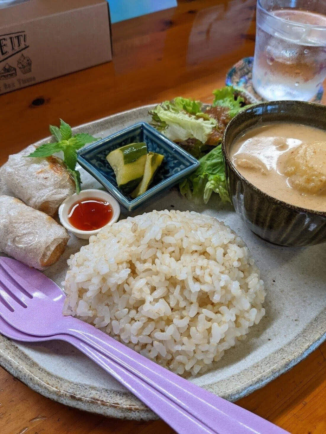 黒潮の家から徒歩5分、ふるさと総合センターの一角にあるカフェ「minica」さんのランチがオススメです。スパイスカレーや、カオマンガイ、ルーローハンなどエスニックなメニューが日替わりで毎日通いたいぐらいです。